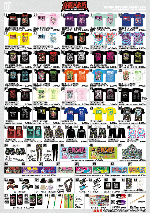 7月2日・3日 京都府立山城総合運動公園 太陽が丘特設野外ステージにて開催された「京都大作戦2016~吸収年!栄養満点!音のお野祭!~」オフィシャルグッズを製作させて頂きました。